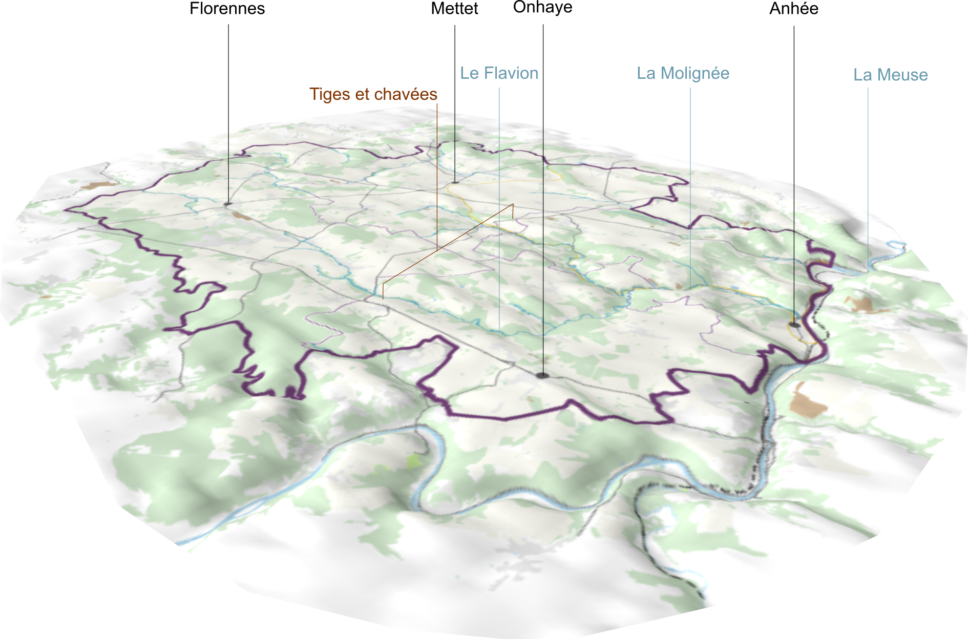 Cette étude fut particulièrement intéressante pour SEN5 : un diagnostic à l’échelle d’un parc naturel en réflexion, couvrant quatre communes – Anhée, Onhaye, Mettet et Florennes. Une échelle intermédiaire passionnante, suffisamment vaste pour dépasser les logiques communales, mais encore très concrète, ancrée dans des réalités locales bien tangibles.